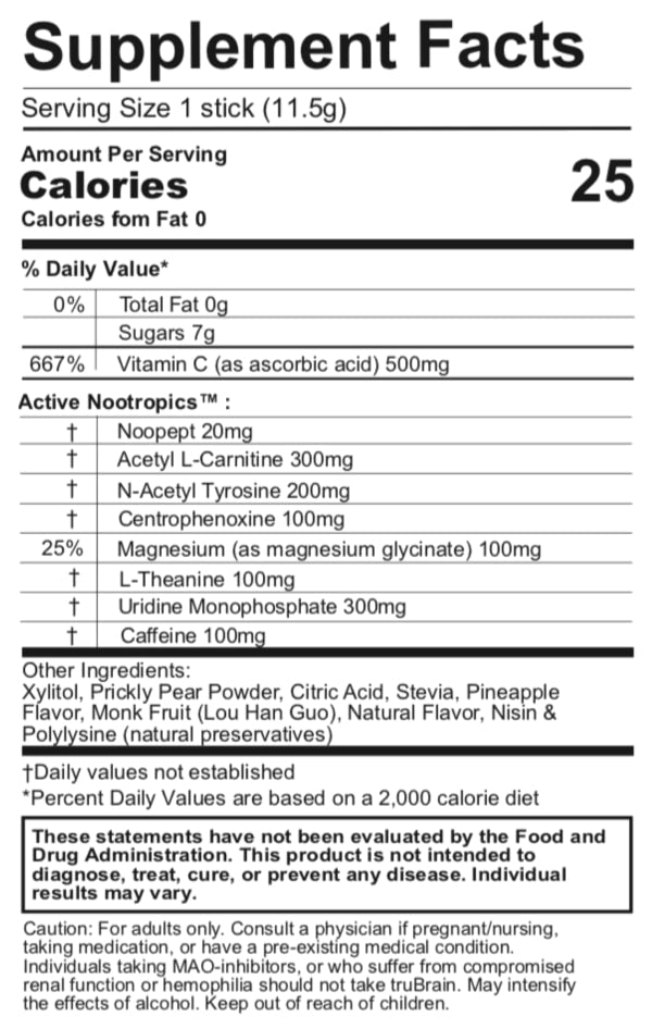 Mix with your favorite drink and take daily with or without food in the morning or afternoon, just not too close to bedtime. Customers tell us placing TruBrain on the bathroom sink helps create a daily habit. Don't take more than 3 per day.